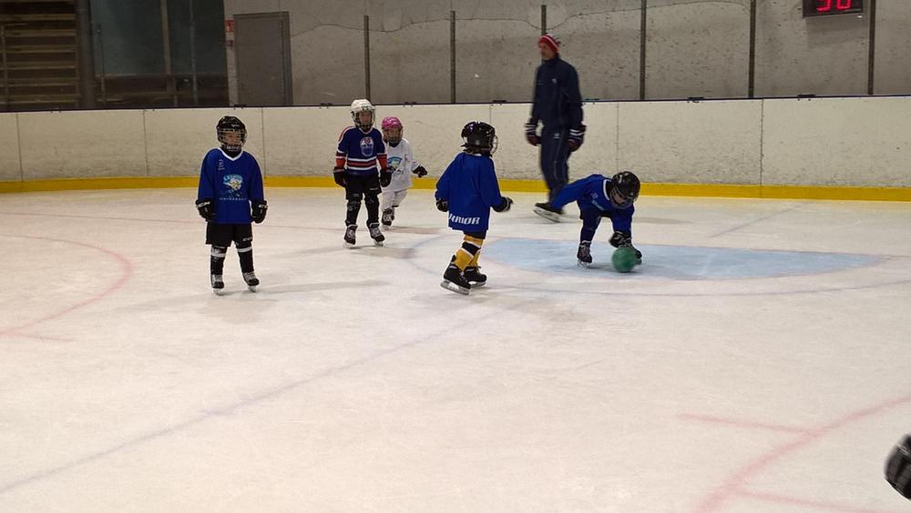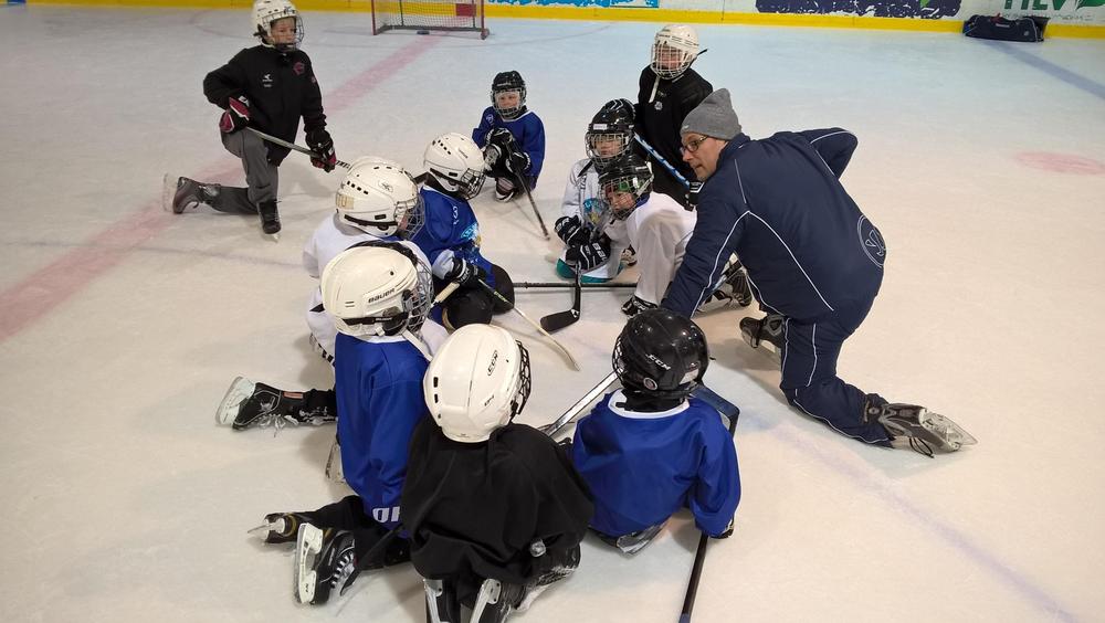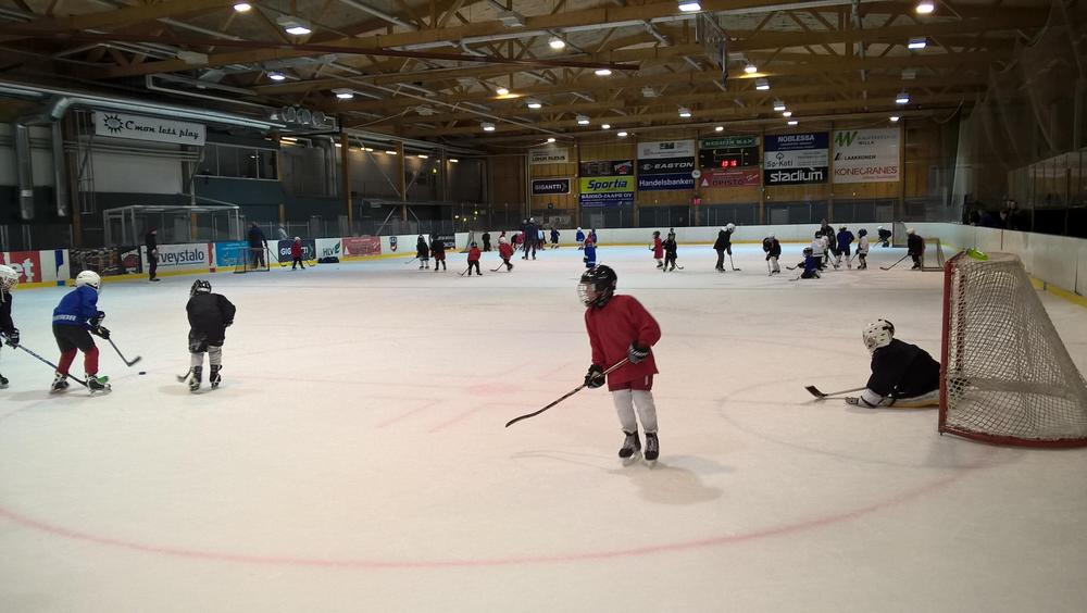 Jää-Ahmojen Leijona-kiekkokoulu on pyörinyt syyskuusta lähtien noin 80 innokkaan jääkiekkoilijapojan ja -tytön voimin. Erilaisia taitoja on harjoiteltu joka lauantai neljällä rastilla; kiekonkäsittely-, peli-, luistelu- ja leikkirastit ovat tulleet tutuksi osallistujille. Tänään kiekkokoulussa pidettiin pelipäivä! Koko 45min pelattiin poikkikentällä ja taukoja ei juuri pidetty - niin innokasta väkeä jäällä jälleen oli!